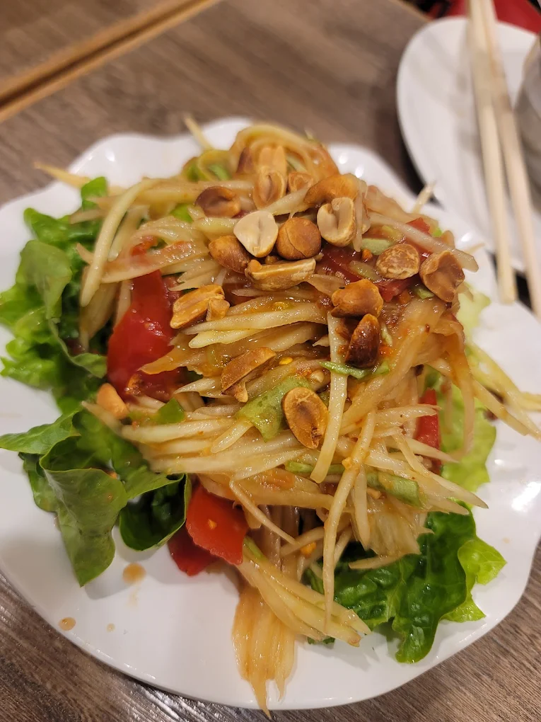Chachawan is a Thai restaurant promoting “Isaan” style dishes. Chefs utilize charcoal grilling, herbs, and marinades to create rich and flavorful dishes. The restaurant offers a wide variety of options, specializing in salads and grilled meats. Gai Yung (grilled chicken) and Larp Moo (minced pork salad wrapped in lettuce) are highly recommended by customers.